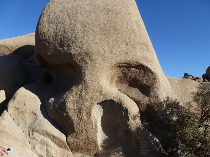Bild links: next to the Tree -:), Skull Rock und die Todesvögel warten auf Beute, also Vorsicht. In den Park bin ich ohne große Erwartungen weil er am Weg lag. Die Kombi aus Mojave- und Colorado-Wüste hat seinen Reiz, Pflanzen und Tiere mit Stacheln weniger. AL war begeistert von den Kletteramigos fast wäre sie auch rauf. Die erste Wanderung wurde auch durchgeführt vom Skull Rock Parking Area zum Skull Rock voll anstrengend bei der Hitze Entfernung: ca 30m ...................... -:) -:) -:) ab dem Campingplatz sind's 4 mi also genau nachdenken bevor startest!!